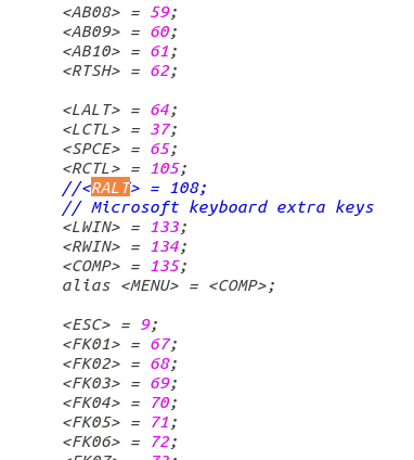 sudo gedit /usr/share/X11/xkb/keycodes/evdev
