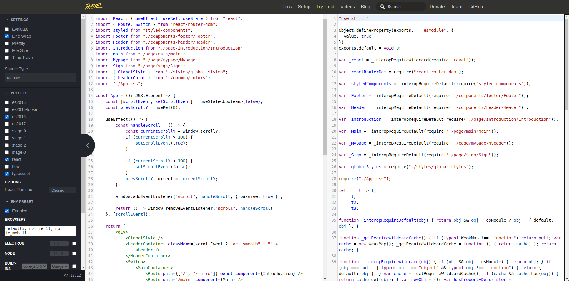 바벨 공식 홈페이지, 변환한 코드는 파이널 프로젝트의 App.tsx 작성한 tsx 파일이 바벨을 통해 브라우저가 알아들을 수 있는 언어로 변환된다. 이것이 바벨..
